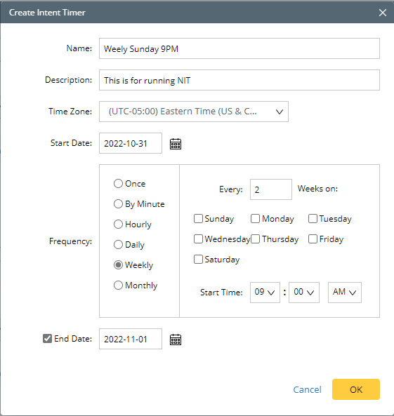 - In the Create Intent Timer dialog box, define the new intent timer.