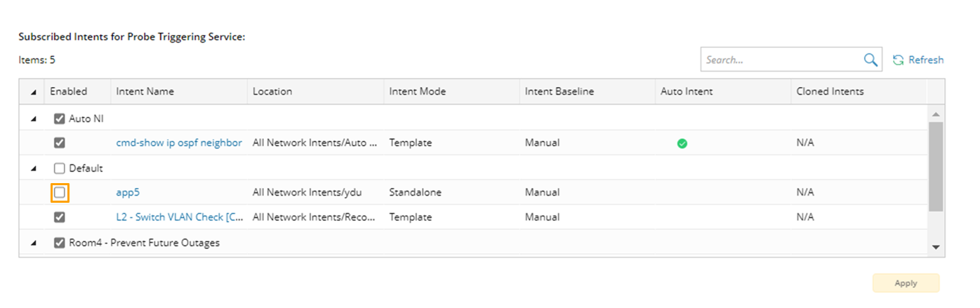 - Disable probe triggering service for an intent: Uncheck an intent item in the Subscribed Intents for Probe Triggering Service area.