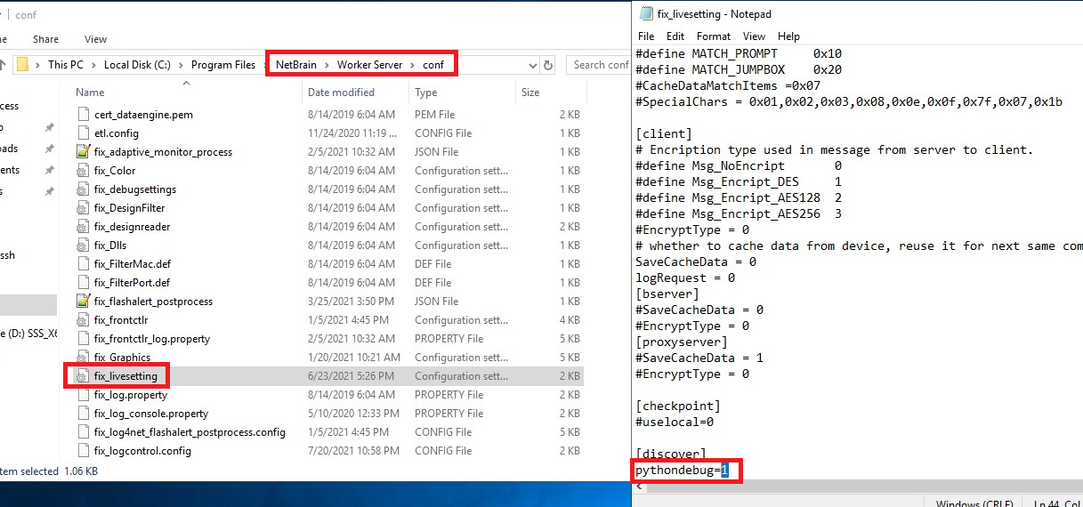 - Before collecting the python error/debug logs, log in to the server and check if the pythondebug parameter is enabled in the …\NetBrain\Worker Server\conf\fix_livesetting for worker server or …\NetBrain\Front Server\conf\fix_livesetting for Front server file (1 indicates enabled and 0 indicates disabled).