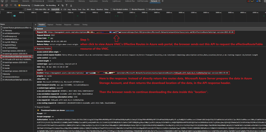 Basically, when people request to download data from Azure, Azure will first create some storage account/container in Azure's Storage service. Then Azure prepares the requested data, such as vhub/vnic effective routes, in that Azure storage accounts. Then Azure returns a "download location link" pointing to the storage area. You need to send another API to get the data in that location. Note that this procedure is required by Azure.
