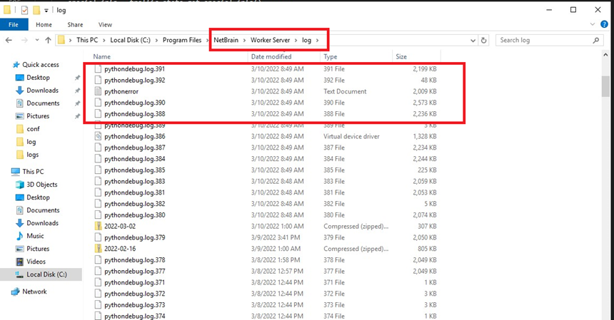 - Collect the python error/debug logs from Worker Server and Front Server. Check the Data modified field to make sure it covers the time when issue occurred.