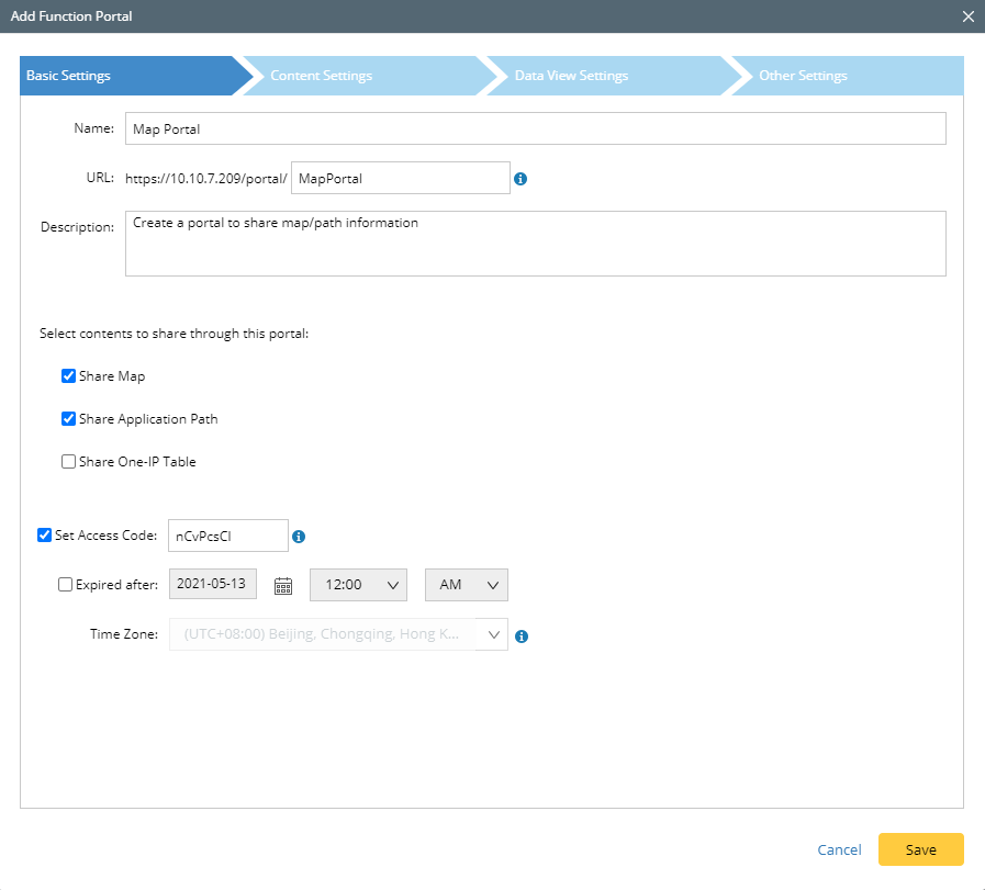 Fill in the second half of the URL. If not, the system automatically fills in the portal name when you fill in the portal name for the first time. Note: The alias for the URL must be unique. It can be configured in the System Management page. See Configuring Base URL for more details. |