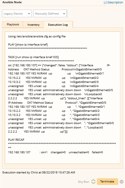 Once the definition is completed, click Run to execute the Ansible node and view its execution log. The following is a sample of execution log: