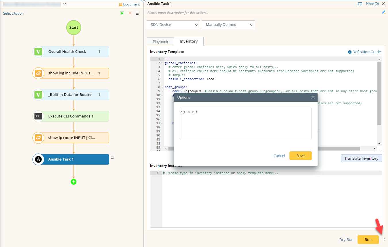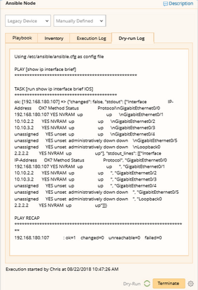 Ansible supports the Dry-run mode to simulate Ansible node execution process. To perform Dry-run, you must sign in with Network Change Creator permission or Network Change Executor permission. Clicking Dry-run hyperlink will generate Dry-run Log containing Dry-run results.