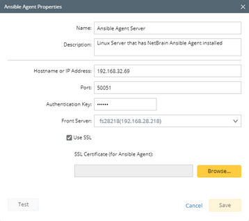 The Authentication key used to establish a connection between the NetBrain Ansible Agent and Front Server. It is hidden under asterisks in user interface. |