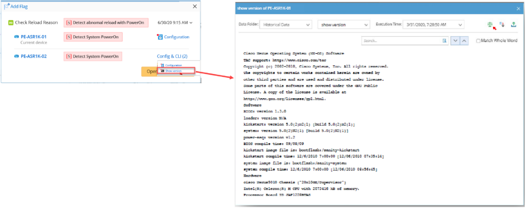 Follow the steps below to view the original CLI commands/config file and then compare the outputs with the historical data to facilitate root cause analysis.