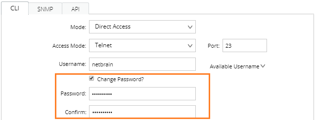 Used to specify the mode and required parameters to access the device via Telnet or SSH. This method contains the following two modes and corresponding parameters: ▪Direct Access Mode — access the device directly to retrieve data. oAccess Mode/Port — the mode and the corresponding port to access a device, including Telnet, SSH, and SSH Public Key. oUsername/Password — the username and password for Telnet/SSH login. By default, the password is not displayed in UI. oChange Password? — If you want to change the password, select this check box. The area for entering the password is displayed. oPrivilege Username/Password — the username and password to enter the privilege mode. By default, the password is not displayed in UI. oChange Privilege Password? — If you want to change the privilege password, select this check box. The area for entering the password is displayed. oJumpbox for FS — select a jumpbox if the device cannot be accessed directly via the Front Server (FS). The Jumpbox must be predefined in the Network Settings. oInteractive Commands — customize the interactive CLI prompts and responsive commands for this device. Besides the exiting two pairs, you can add more pairs. For detailed rules and formats, refer to Prompt and Command Definition in GUI. oPrompt Settings — customize the advanced CLI prompts and commands. See Configuring CLI Prompts for more details. ▪Via Other Devices — access the device through another device to retrieve data, for example, the parent device of a virtual device. |