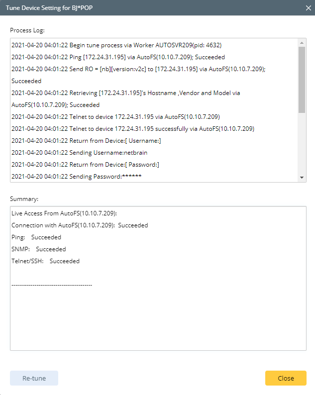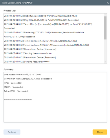 4.Click Tune to check the reachability of live devices by using the above settings. If not reachable, the system will overwrite the settings by polling the credentials configured in the Shared Network Settings. You can view the process log and tuning results as follows.