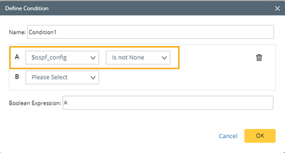2.At the Output node, define conditions for the Qapp to execute the subsequent actions. In this case, define a condition to check that a device is configured with OSPF.