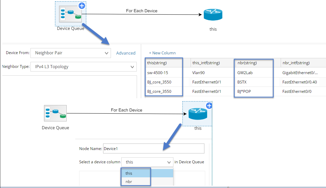 If a row in the Device Queue node has multiple device columns, you need to add different device nodes. For example, if you build devices in the Neighbor Pair pattern in the Device Queue node, you need to define two device nodes, with one node to execute a CLI command on this device, and the other one to execute a CLI command on this device’s neighbor.