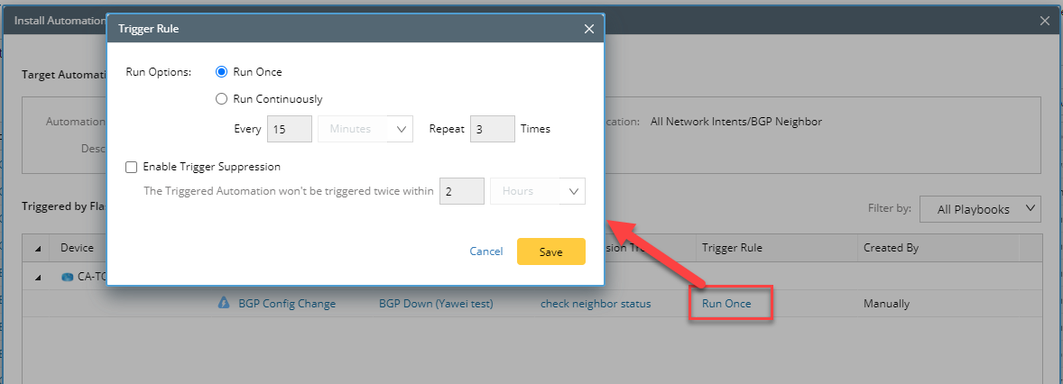 •Enable Trigger Suppression: to avoid multiple automations being triggered in a short time interval; After the option is checked, the Network Intent will only be triggered once during the defined time interval.