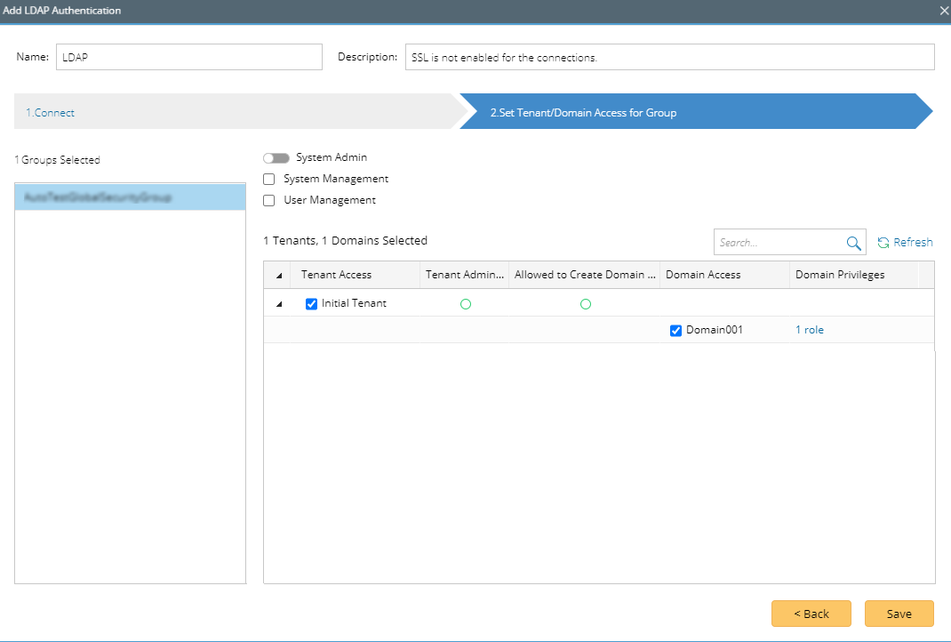 3.Click Add LDAP Authentication. A Wizard is opened to guide you through the steps to connect to the LDAP server and configure the tenant or domain access privileges for the imported user accounts.