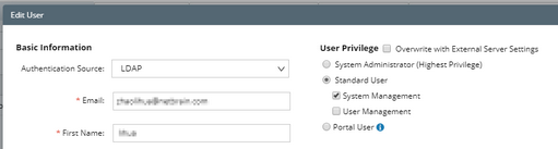 Note: To prevent the assigned roles and privileges of an external user account from being synced with any changed authentication settings, you can lock the user rights as follows. See Creating User Account for more details.