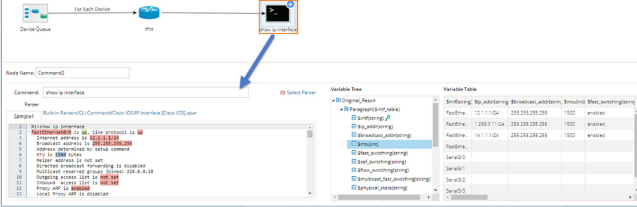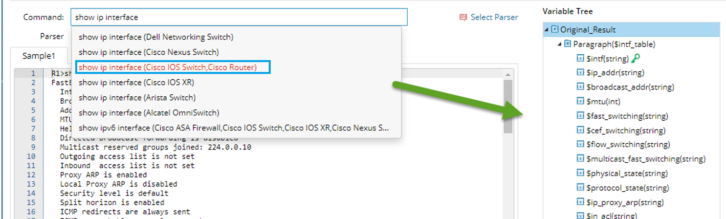 The system provides built-in parsers for most CLI commands. A parser is a file that parses and extracts major variables from command lines or device configurations for specific device types. When you enter part of a command, the related parsers (commands with applicable device types) are displayed in a drop-down list. When you select a parser, the parsed variables will be loaded in the Variable Tree pane.