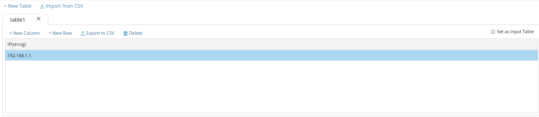 1.Click New Table. The table1 tab is created. 2.In the table1 tab page, click New Column > Static Variable to define the column instance in the Column Property dialog box. 1)In the Name field, rename the column header name, for example, IP_address. 2)Specify the column type (string by default). 3)Specify an initial value for the column. 4)Click OK. 3.Click New Row to create a row to display the initial value.