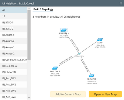3.Click the X L3 Neighbors hyperlink (for instance, 25 L3 Neighbors). A preview map containing the searched device (for instance, BJ_L2_Core_3) and its neighbors are displayed.