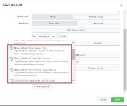 After the Splunk App setup is installed, you can select NetworkBrain alert action to define how to create map and execute Runbook Template when Splunk generates alert. NetworkBrain provides the following alert actions: