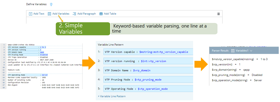Simple variable parser can parse a single-value variable, such as version number, etc., by anchoring keywords before and after the variable. See Define a Simple Variable Parser for more details.