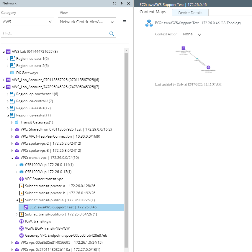 2.In the Network pane, select Network Centric View > View by Accounts. The AWS data model is organized in this order: Account > Region > VPC > Subet.