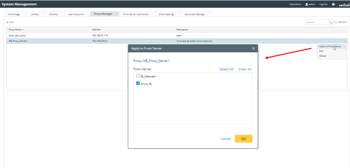 2.Click the downward arrow aside the desired Proxy Server and select Apply to Front Server.