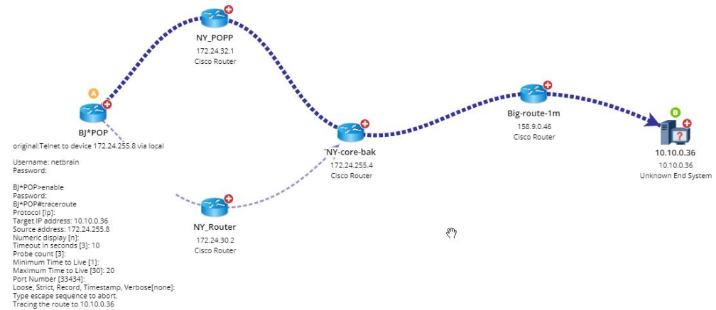 Draw the traceroute result hop by hop on a map based on the IP address of each hop. The parameter of this API is a sequential hop list and you need to enter all hops based on the sequence that a hop is drawn. ips — The IP address of a hop. Input all load balance IP addresses in the ips field if a hop contains load balance. For example, 'ips':["IP2","IP3"], IP2 and IP3 are loading-balancing hop. |