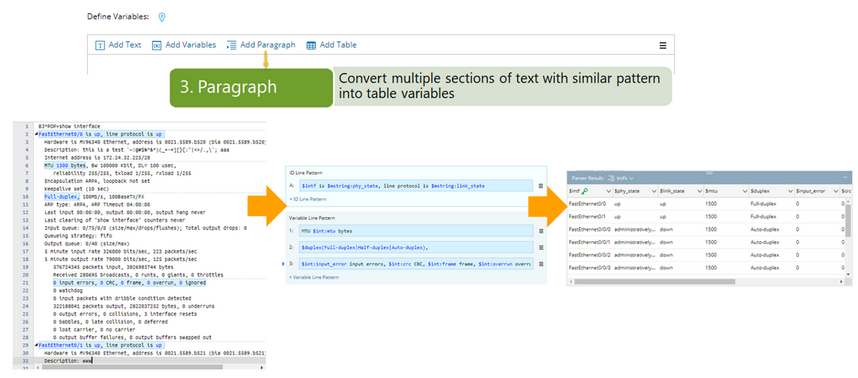 Paragraph parser can parse variables in recurring paragraphs, such as collisions and CRC errors for interfaces, etc., by anchoring paragraph identifier (ID) lines. See Define a Paragraph Parser for more details.