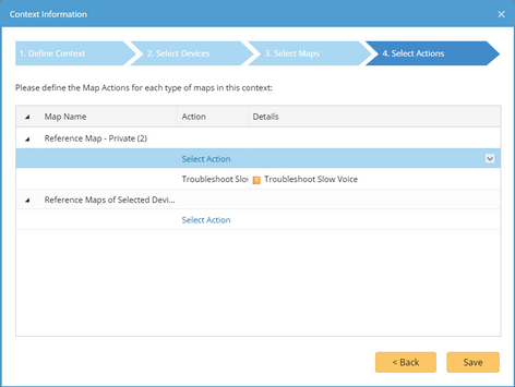 4)Select context actions. You can define actions for a specific map and a class of map (such as site map and device group map). In this example, select the runbook template Troubleshoot Slow Voice (to monitor QoS interface parameters and highlight QoS configuration and QoS Interface Queuing Strategy). Then click Save.