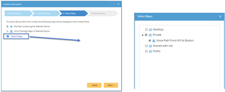 3)Select context maps. The optional maps contain site maps and Layer 3 or Layer 2 topology maps relevant to the target devices. You can also select a predefined map as needed. In this case, you can calculate the voice flow path from NYC to Boston and add it as a context map. Click Next.