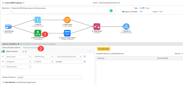 Example: Expand the logic to all Cisco devices with HSRP configured. You can create a classifier: device type matches Cisco IOS switch or router; the configurations contain the keyword standby.