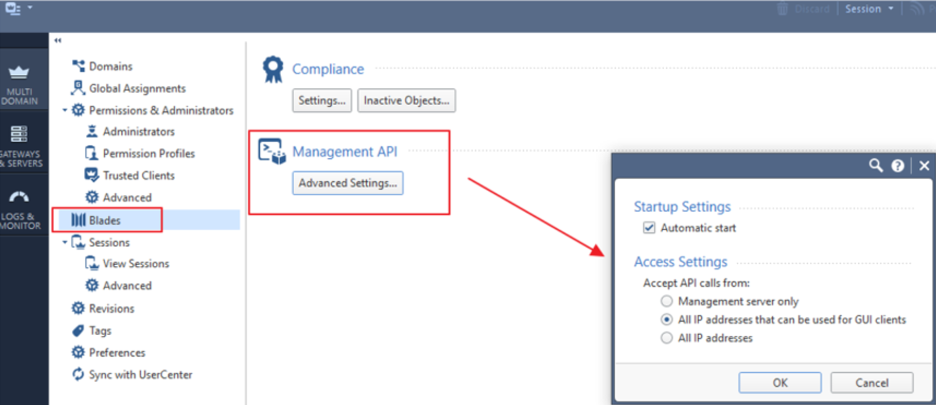 2.Enable API access to accept API calls from your NetBrain Front Server. Go to Blades > Management API > Advanced Settings > Access Settings, and select the All IP addresses or All IP addresses that can be used for GUI clients option.