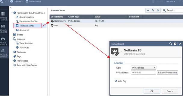 Before discovering Checkpoint Firewall R80, you need to set up an account and API access permission in your Checkpoint Manager so that your NetBrain system has access to the Checkpoint Management Domain.