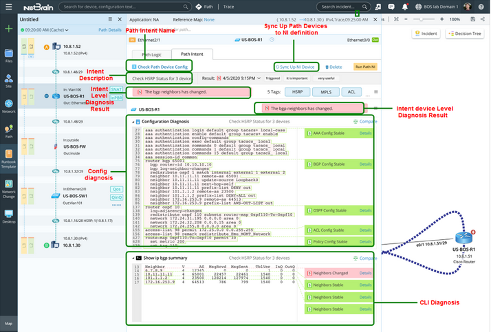 In the newly provided Path Intent pane, you can directly execute path intent and then directly view the results of intent diagnosis in the lower area.