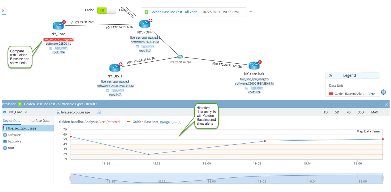 Golden Baseline serves as the reference standard of “healthy” status for various types of data. It can be auto-calculated based on historical statistics or manually defined, and can be further used as a basis or foundation for network management analysis and comparison, for example, troubleshooting.
