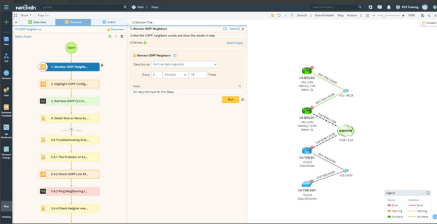 With NetBrain, NetOps professionals leverage their own expertise to automatically record standardized procedures in a runbook as they detect, diagnose, and fix issues. The steps they use to diagnose issues, including the use of CLI commands on multiple devices, are automated in Runbooks.