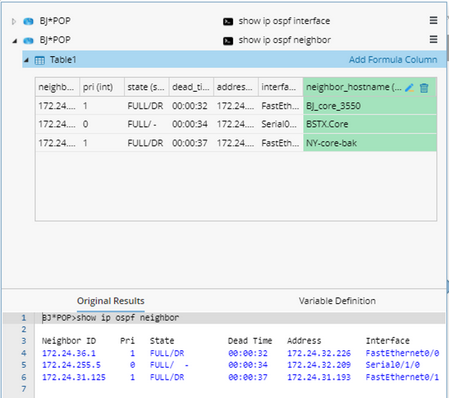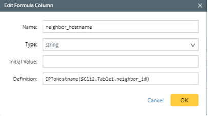 Network Intent supports to add Formula Column to table variables, which converts the original variables into different formats or different values. For example, converting the short name of interface Ether1/1 into full name Ethernet1/1, or converting the IP address to the corresponding device hostname.