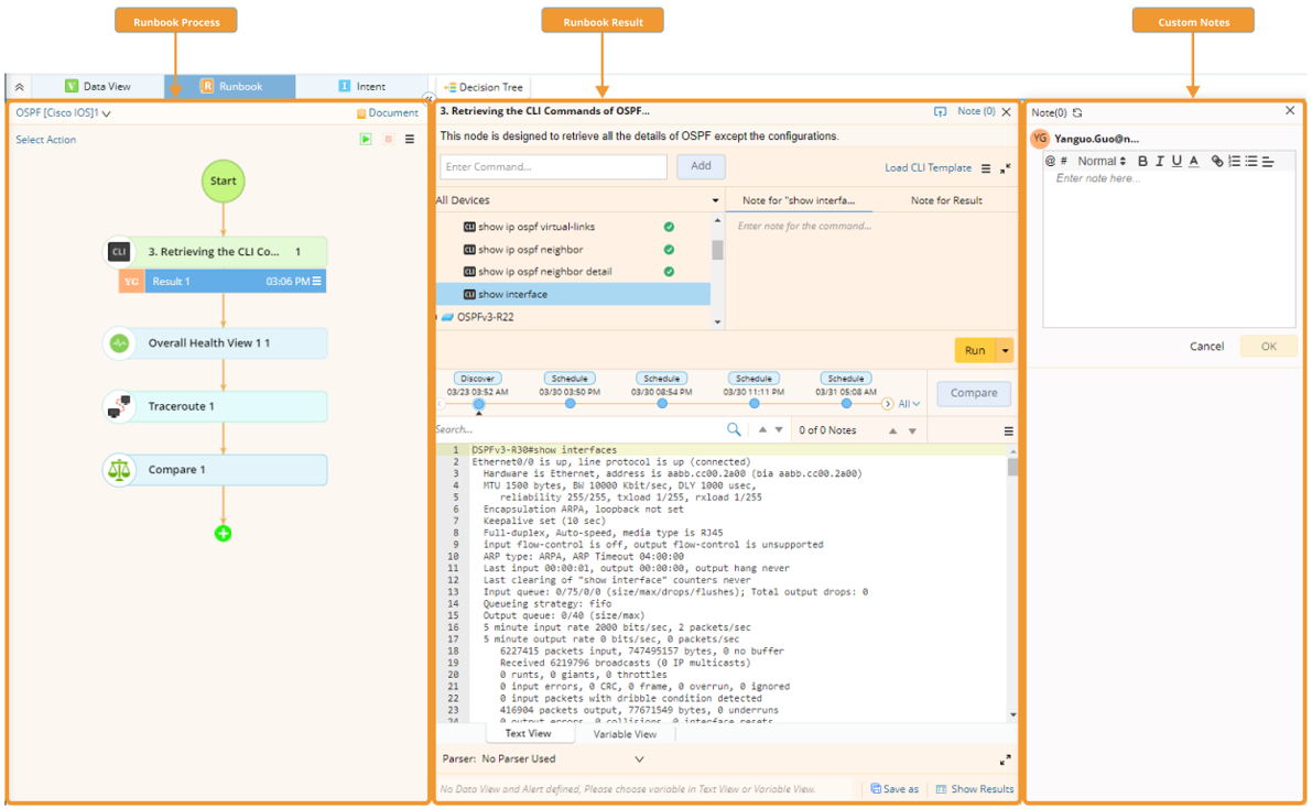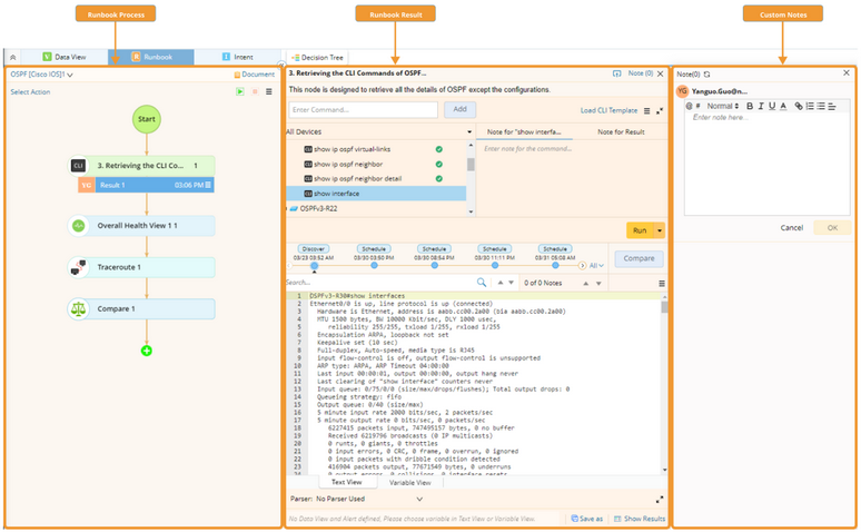 For example, Tier 1 engineers execute CLI commands to troubleshoot problematic devices on a map, document the diagnosis and escalate the issue by mentioning next-level users in the runbook. Tier 2 engineers re-execute the runbook, and continue to add a Compare node to evaluate data changes between the two CLI outputs, and then escalate to Tier 3. Each Tier can continue to build on top of what has been done previously by checking analysis results and notes.
