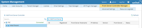 3.In the Front Server Controller Manager, select the target tenant and click Add Front Server.