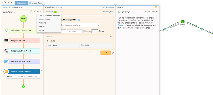7.Add the Overall Health Monitor node, and then click Run. See Running a Qapp for more reference. After running the Qapp, make a note to describe the issue and enter @ to mention admin for escalation.