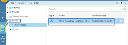 The body contains the following parameters: ▪folderid (string): The ID of the folder from which you want to get the files. Return the root folder (Public) if folderid is null. ▪fileTypes*(array): the file types you want to retrieve. There are three file types: ▪0: Folder ▪11: Map ▪21: Dashboard Example: { |