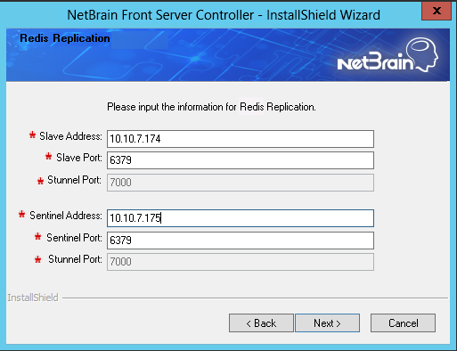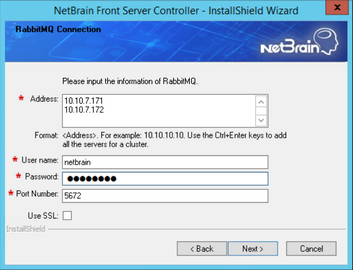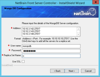 Tip: You can enter the fully qualified domain name (FQDN) of the MongoDB Server if all NetBrain servers are managed in the same domain. For example, test.netbraintech.com:27017.Note: Enter the FQDN of MongoDB Server and the port number if you configure one while installing NetBrain Database Server.