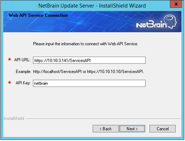 7)On the Web API Service Connection page, enter the following information to connect to your NetBrain Web API Server, and then click Next.