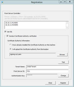 a)Select the Use SSL check box to encrypt the connections to Front Server Controller with SSL. If SSL is disabled on Front Server Controller, leave it unchecked and skip step b) and c).