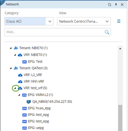 Tip: In the Network Centric View\Tenant View, ACI data model is organized in this order: Tenant > VRF > EPG (Endpoint Group) > Endpoint. You can view the following information of a tenant (or VRF) in the ACI fabric: