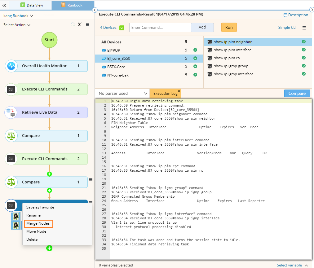 Before you merge one type of action nodes, you must decide which action node that you want to keep as the foothold of the action type. All execution results of the merged action nodes will be intensively saved with the foothold action node, and they will be re-ranked by the execution timestamp.