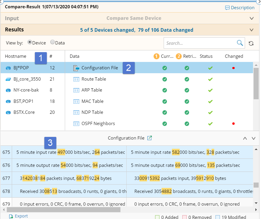 6.After the comparison is finished, select a device and a changed data type to view the detailed changes. See Comparison Results for more reference.