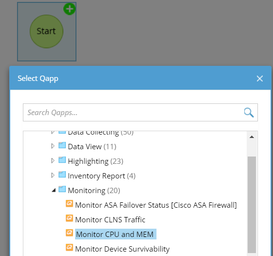 3.Point to the Start node and click the icon to add the Monitor CPU and MEM Qapp.