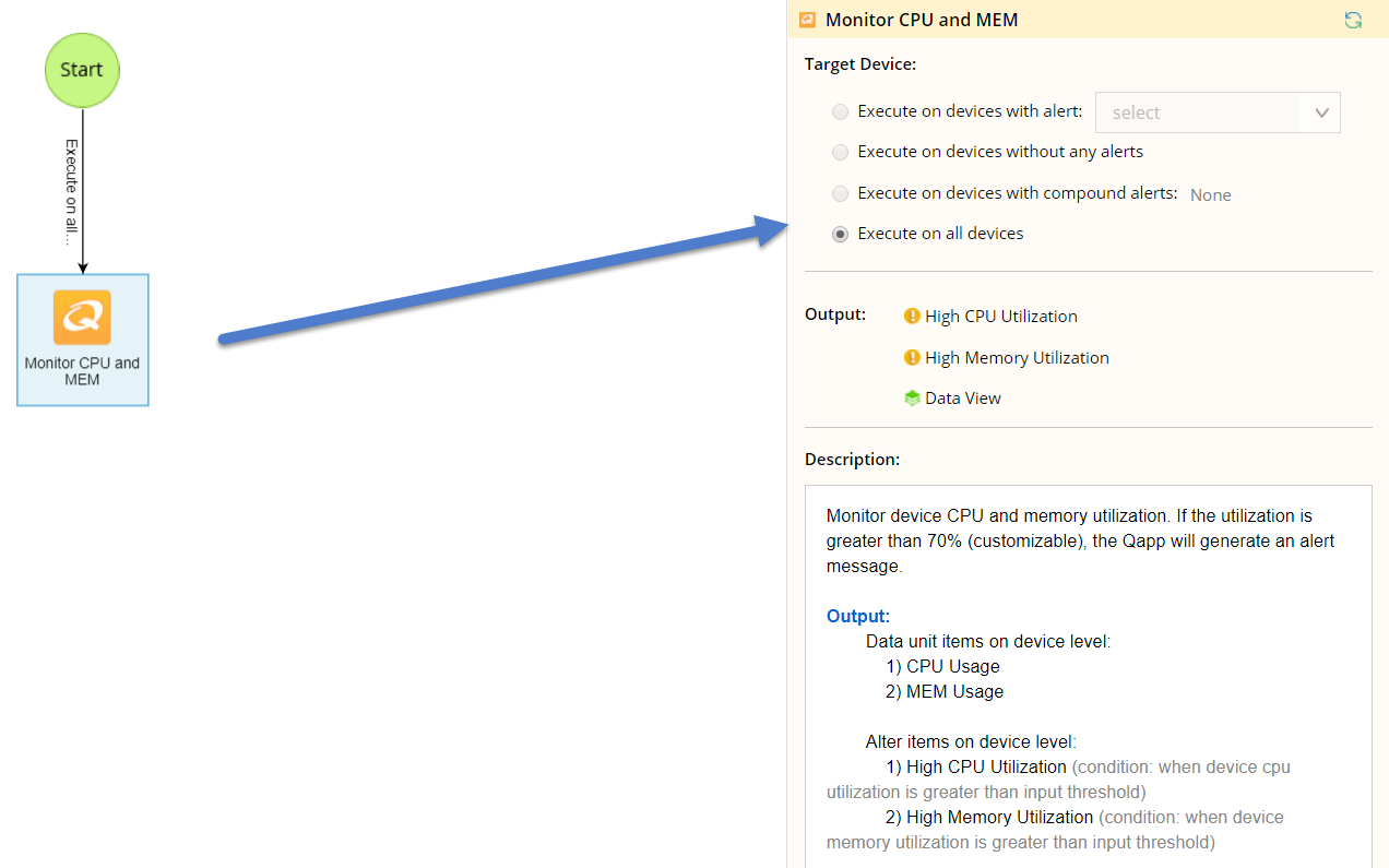 2)Specify target devices for the downstream Qapp. In this case, select Execute on devices with alert and then select the High CPU Utilization alert. It means that the downstream Qapp will execute on the devices that trigger the High CPU Utilization condition defined in the current Qapp node. See Target Devices for more details.