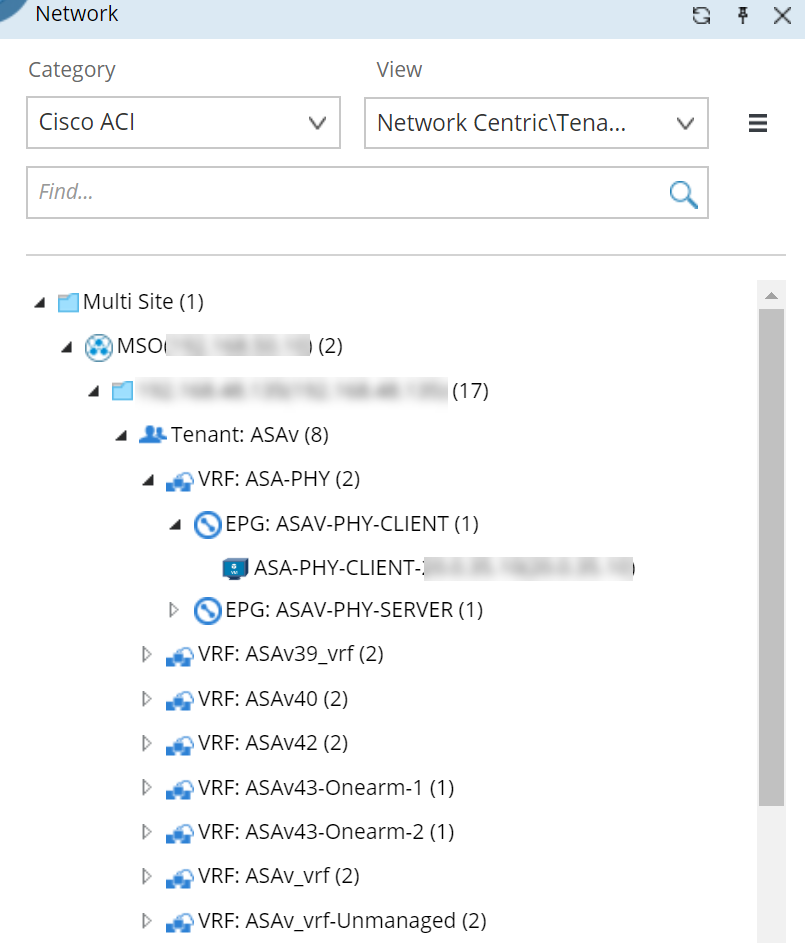 2.In the Network pane, select Network Centric View > Tenant View. The ACI data model (Multi Site) is organized in this order: Multi Site Folder > Multi Site Orchestrator > APIC Domain > Tenant > VRF > EPG (Endpoint Group) > Endpoint