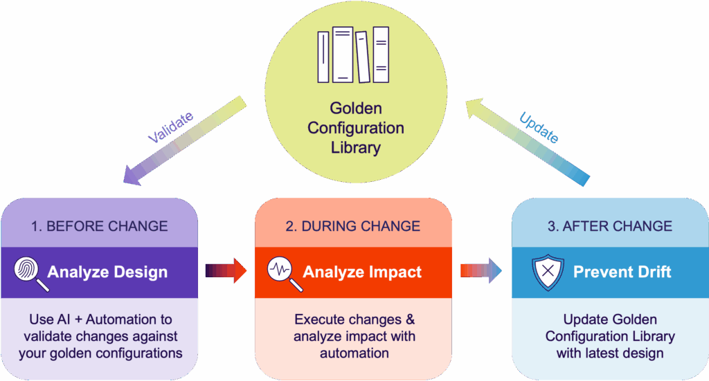 Fije el diseño dorado de su red. NetBrainLa plataforma de automatización basada en intenciones impulsada por IA descubre configuraciones doradas y brinda un monitoreo continuo de triple defensa (antes, durante y después del cambio) para garantizar que nunca se desvíen.